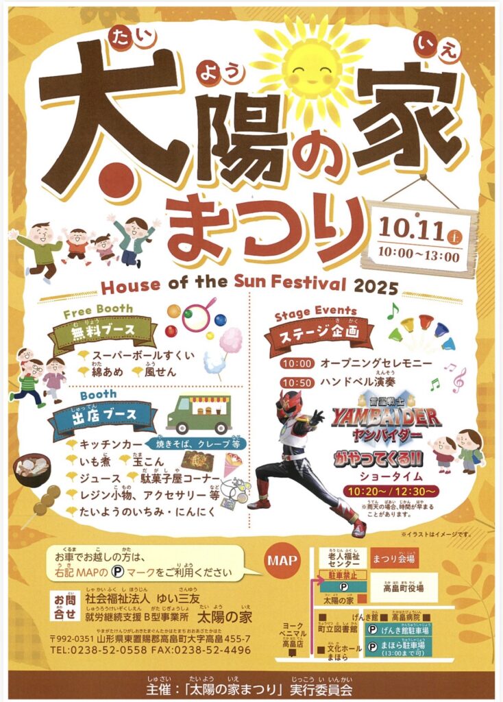 太陽の家まつり10/11 / イベント, お知らせ / By yambaiadmin 就労継続支援B型事業所 太陽の家さんにて ①10:20〜 ②12:30〜の2回ステージイベントです。お時間ある方は是非お越しください。